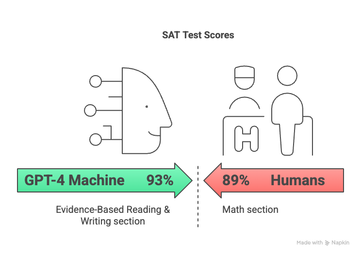 Meanwhile, GPT-4—a machine—scored in the ~93rd percentile on the SAT Evidence-Based Reading & Writing section and ~89th percentile on the Math section .